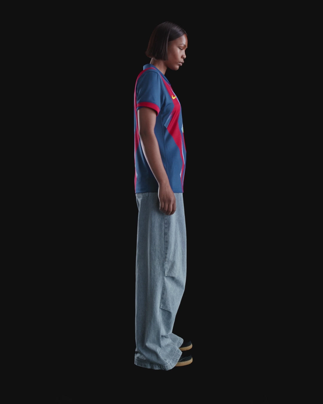 Le quatrième maillot féminin du FC Barcelone pour la saison 2025/26 se distingue par son style audacieux et vibrant, alliant les couleurs traditionnelles bleu et grenat à un design moderne et dynamique. Les rayures texturées et déformées symbolisent l'énergie du club et son lien avec la créativité de la ville.