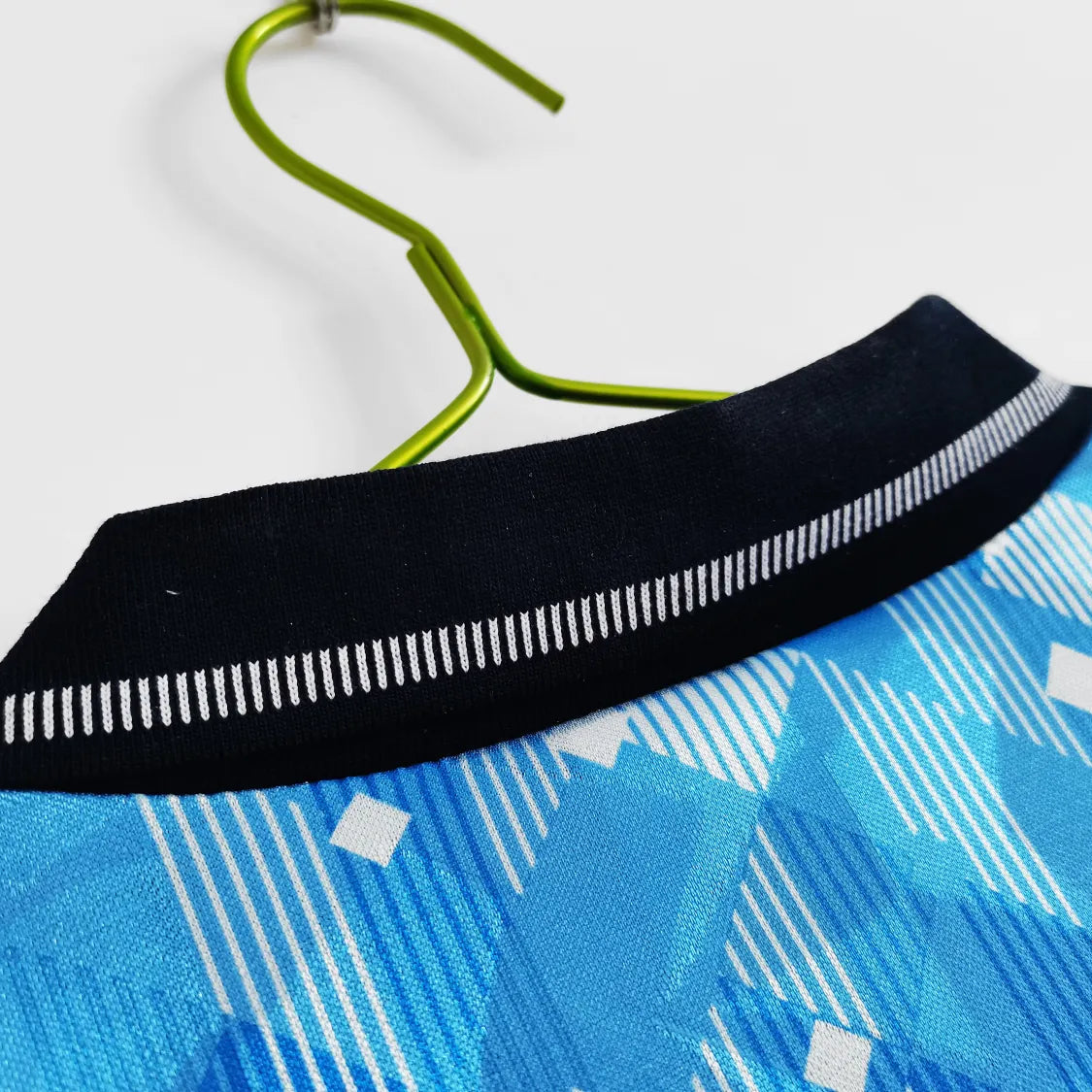 Le maillot rétro édition spéciale Angleterre 1990 célèbre l'âge d'or du football anglais, inspiré du modèle emblématique porté lors de la Coupe du monde 1990 en Italie. Son design audacieux associe le bleu ciel à des motifs géométriques, une bande blanche diagonale et un triangle rouge éclatant, créant un look unique et inoubliable.